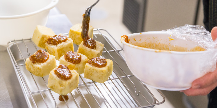 毎日、3パターンの日替わり弁当を用意する。一つのお弁当の中で味付けが重ならないように、焼き物、炒め物、煮物とすべての料理工程を駆使し、味付けにも醤油、みそ、トマト系、酢、マヨネーズなどバリエーションを持たせる。単品の総菜も含めると1日で30品ほど作るが、「レシピは特にないんです」と言う。家庭で料理を作るように、冷蔵庫をのぞいて、今日の材料を並べて、「何にしようかな~」と考え、実のお母さんと一緒に作り始める。