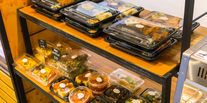 店内は白と明るい木目をベースに、黒をアクセントにしたまるでカフェのようなオシャレな空間。弁当やお総菜が並ぶ横には、コンクリートの壁に窓。海外の知らない町に迷い込んだかのような楽しさがある。奥ではお弁当にほかほかのご飯をよそったり、料理を温めなおす。「つい温めますかって聞いちゃう。コンビニで働いていた癖ですね」と笑顔が弾ける。