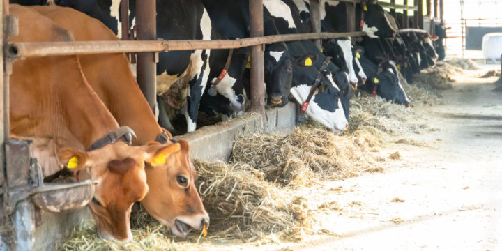 おなじみ黒白模様のホルスタイン(写真奥)と、高品質で濃厚な乳が特徴の乳牛ジャージー牛(写真手前)