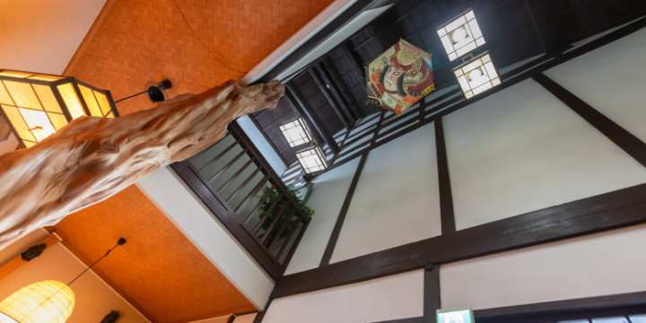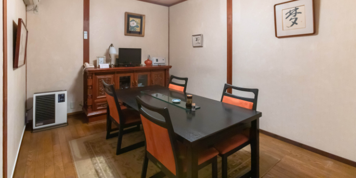 入口の土間は吹き抜けになっていて、高い天井に凧が泳ぐ。靴を脱いで上がるロビーは視線が奥へとまっすぐ抜ける気持ちのいい空間。土間にはテーブルが3つ、ロビーに座卓が3、4卓。「上下の冬は寒いから、これでこらえてくださいね」と、一卓ずつにファンヒーターが置いてある。