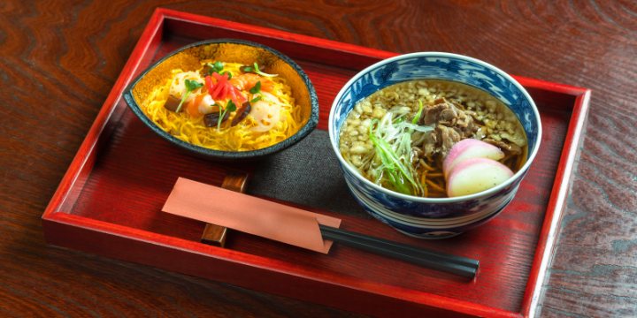 メニューはぎゅ~そばにぎゅ~うどん、茶そばにうどん、親子丼、そしてちらし寿し。量の大小を選んでセットにできる。上下特産のぎゅ~そばは、各店でトッピングや添える料理で特徴を出しているので、おすすめのちらし寿しとのセットでお願いした。