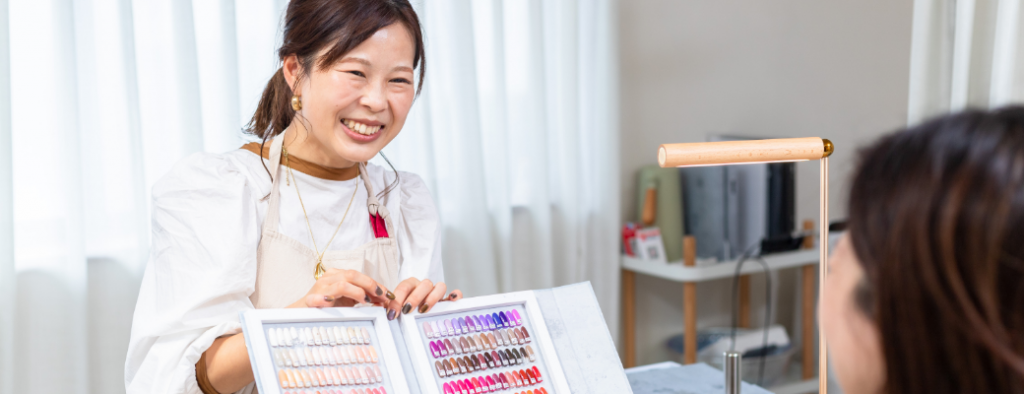 取材で、池田さんのヒアリングを体験した。サンプルから好みの色を選んで、肌にのせてみる。好きな色と似合う色が違うこともあることに気づき、池田さんと相談しながら色やデザインを決めていく。池田さんは、私の話や洋服や持ち物から好みを把握して、全身のコーディネートを考えながら似合うデザインを探っていく。「トータルコーディネートの中で爪だけがうかないようにしたい」というのが池田さんのこだわりだ。