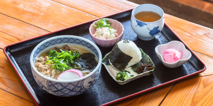 おすすめの樽ちゃんうどんとおむすび、小鉢2つ付き