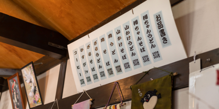 そのほか山かけうどん、肉うどん、ざるうどんがあり、そばもある。夏には紫蘇ジュース、秋になると生姜シロップを販売するなど、主婦の感覚と経験を生かした季節ならではのメニューも登場する。