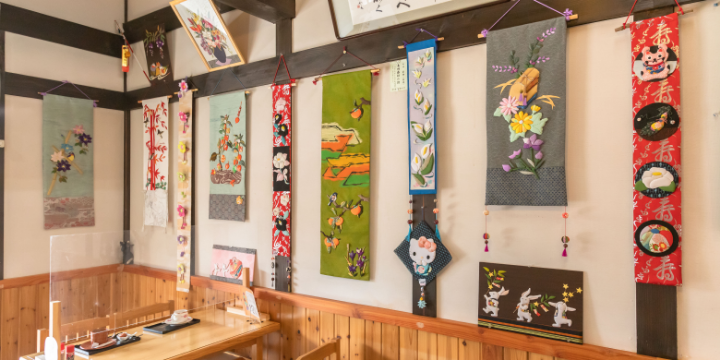 押絵のタペストリーを展示。手芸品でにぎやかな店内