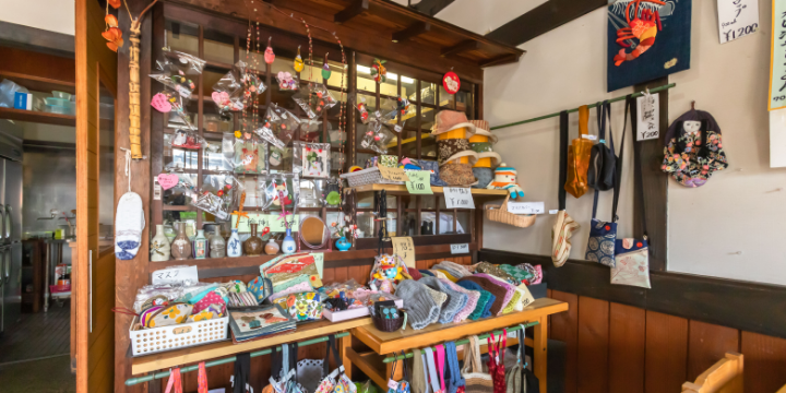 席は全席32人。テーブル席や囲炉裏をかこむカウンター席もある。地域の高齢者の集まりやサークル仲間の食事会、法事の食事会などにも使われる。店内は手芸品でにぎやかだ。樽ちゃんが通っていた押絵教室の皆さんの作品が飾られ、作品を眺めながら過ごしたい手芸ファンも集まる。作品を見たお客さんから着物や帯・古布を頂くこともあるそうだ。ニット帽などの編み物、マスクや布のバッグなどは、手芸が得意な樽ちゃんの親戚やスタッフメンバーの一人の作品。帽子300円とリーズナブルな価格で販売されていて、つい手が伸びる。スタッフおそろいの調理帽子もお礼にとプレゼントされ、エプロンは器用なメンバーのセンスで夏・冬用と作ってもらった。