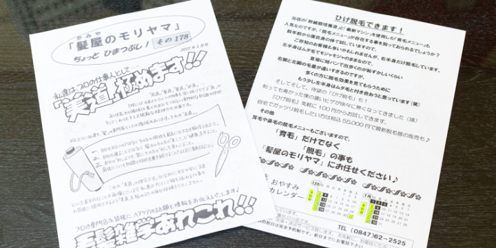 森山さんは、脱毛効果や家族の近況などを週1回程度、動画で配信(YouTube)している。上下町に戻って来た約20年前からブログを始め、15年前からは毎月1回、チラシを作ってお店で配布している。2022年11月現在で188号となり、チラシを集めるために毎月来店するファンもできた。「モリヤマは面白い!」と思っていただくための情報発信だ。