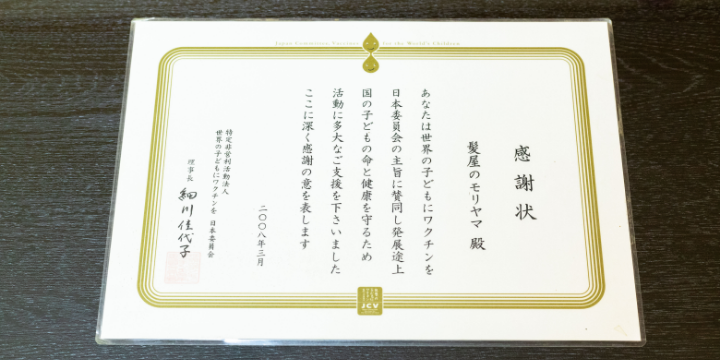 14年前から続けていることもある。「NPO法人 世界の子供にワクチンを日本委員会」への募金だ。1人の来店につきポリオワクチン1本を贈る活動で、同店はこれまでに約3万本を支援した。「モリヤマのお客さんは世界のどこかの子供たちを笑顔にする取り組みに参加していただいています」と話す。