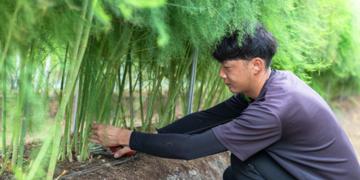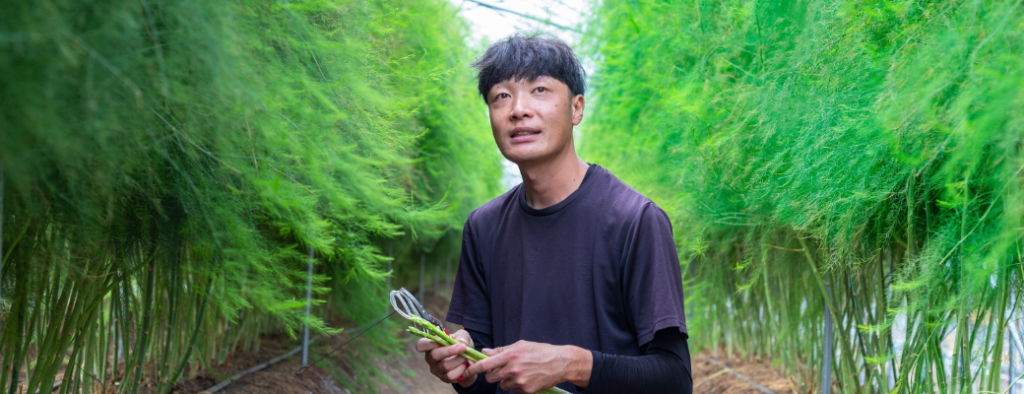 上下町のアスパラガスの収穫は春から秋にかけた半年間。春先のアスパラガスは柔らかく味が濃く、夏からのアスパラガスはあっさりジューシー。「上下町は朝晩の寒暖差が大きく、その環境がアスパラガスを美味しくてくれています」と話すのは、上下七色農園を経営する林新二さんです。林さんは10年以上続けた仕事を辞め、2022年に就農した若き農業者。林さんのチャレンジストーリーから、林さんのアスパラガスが美味しい理由が見えてきます。