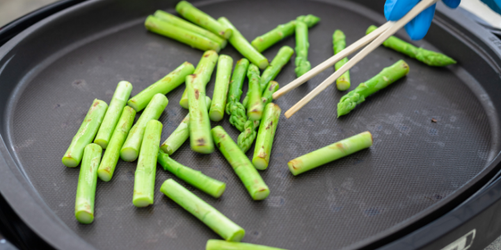 収穫したばかりのアスパラガスを、ホットプレートで焼いてくれた。ふたを開けると、緑が一段と明るくなっている。何の味付けもしないまま口に入れる。穂先の軟らかさと、茎の瑞々しさに驚いた。まだ熱いと分かっていても、アスパラガスを取る手が止まらない。
