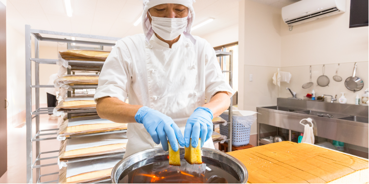 特にこだわっているのが、スポンジ生地のきめ細やかさだそうで、たっぷりと含ませたシロップに負けないしっかりとして、それでいて口当たりのよいスンジ生地が理想だと先代から教わった。難しいのは、同じ品質のものを作り続けることだそう。季節の変わり目は特に難しい。「材料や作り方を微調整して同じ味にするのが職人の技」だと前原社長は言う。