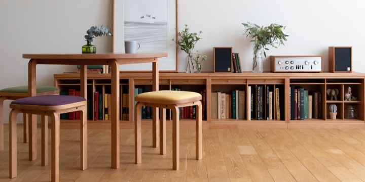 デントーといえば、家具を思い浮かべる人が多いのではないだろうか。同社は2012年、額ぶちづくりに加えて、家具づくりをスタートさせた。ラインナップは、額ぶちづくりの機械をそのまま使った、スツールやチェア、テーブルなどの小ぶりな家具。スツールやダイニングテーブルの脚部には、額ぶちの「留め」という技術を使っている。場所をとらないようにスタッキングできるなど、暮らしの中に溶け込む工夫もされている。お客様の声を聞きながら、家具のアイテムを順調に増やしてきた。