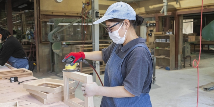 これらのフレームはすべて人の手でつくられている。工場をみわたすと、デジタル表示はあってもコンピューターはない。人の目で木目の方向や木の反り、色をみて、最終的な木目の出方をイメージしながら形にしていく。額ぶちの角は、端を45度にカットした木材が隙間なくぴたりと組まれていて気持ちがいい。研磨の工程では、表面をペーパーで磨いてはオイルを塗り、見えてきた毛羽立ちをさらに細かい目のペーパーで磨く。この工程を何度も繰り返し、指先に邪魔するものがなくなったら完成する。