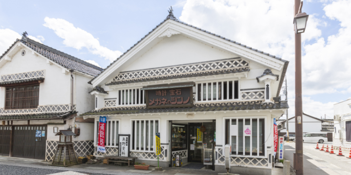上下商店街で白壁がまぶしい「メガネのシンノ」。1920年に時計屋主体で創業し、現在は3代目となる眞野秀明さんによる眼鏡と補聴器の専門店です。