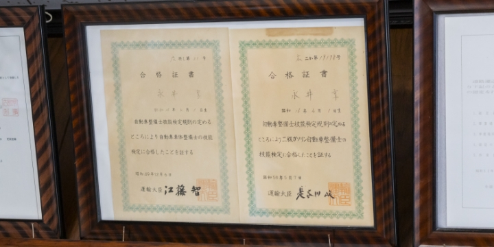 自動車の開発が進み、車には新しい機能がどんどん搭載された。満足のいく仕事をするためには、自動車整備士の資格と運輸局の整備認証を得ることが必要だと感じた享さん。仕事を終えてから、ときには徹夜もしながら資格取得の勉強をして、40歳で2級を取得。「2級は3回目で取得できたんよ。3回目のときは手ごたえを感じたね」と笑顔で振り返る。