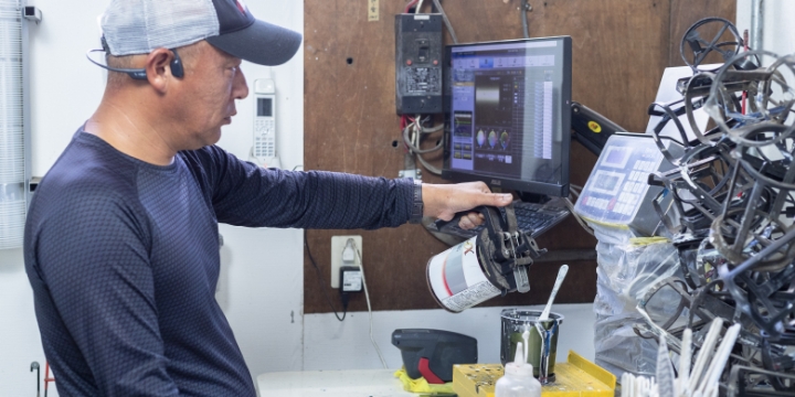 九州で塗装を学んだ悟さんは、「色合わせは途方もない作業でした。自分が納得いくようになるまで場数を踏むしかなかった。それが今は専用のカメラで撮影するとパソコンが色を数値化し、塗料の割合を出し、それを混ぜれば元の色にかなり近い色ができる。10分、20分で色が合う。かかる時間がかなり短縮されました」と話す。ただ、「塗装で100%色を合わせることはできないんです。最大限の努力と技術を使って、お客様に納得していただける色を目指すしかないんです」と話す。