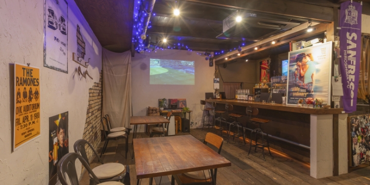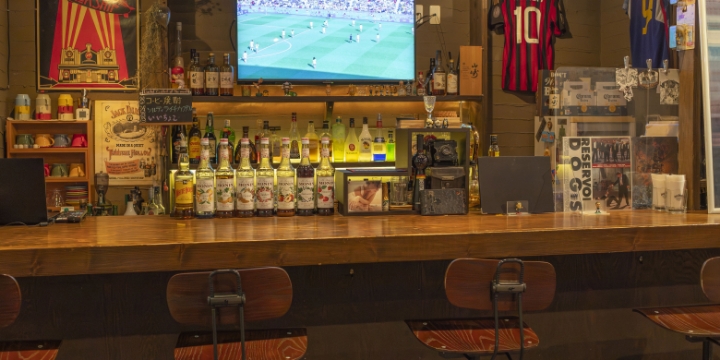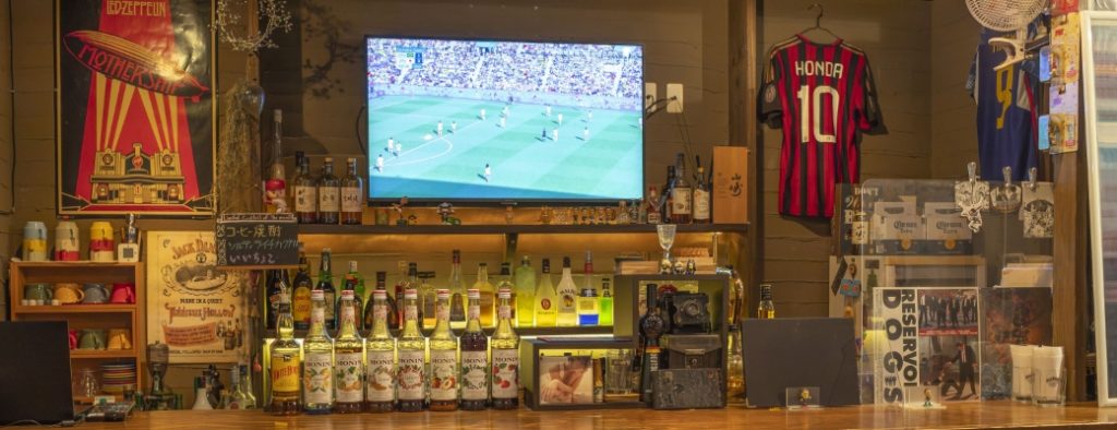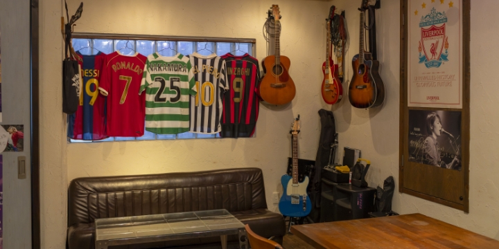 ドアを開けて、もう一枚の扉を引くとビートルズの音楽が流れてきた。壁やモニターにサッカーの試合の映像が流れている。どっしりとしたバーカウンターにテーブル席。振り返るとギターが並び、サッカーチームのユニフォームがディスプレイされている。合間に映画のポスターや『AKIRA』の漫画。思わず「懐かしい!」と口に出してしまう人も多いはずだ。